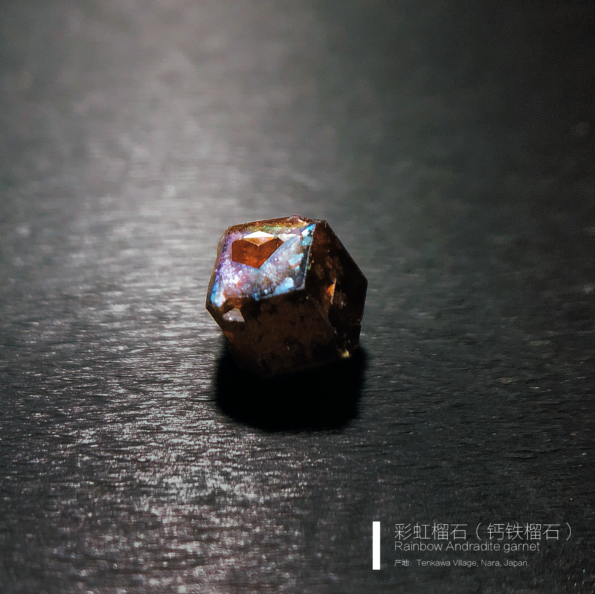 非常小的一颗晶体而且背面不完整,不过虹彩还是非常美丽的……就是很难对焦拍了好久,虹彩的成因是由钙铁榴石和钙铝榴石的结晶层相互重叠堆积而成,产生了光的干涉现象。