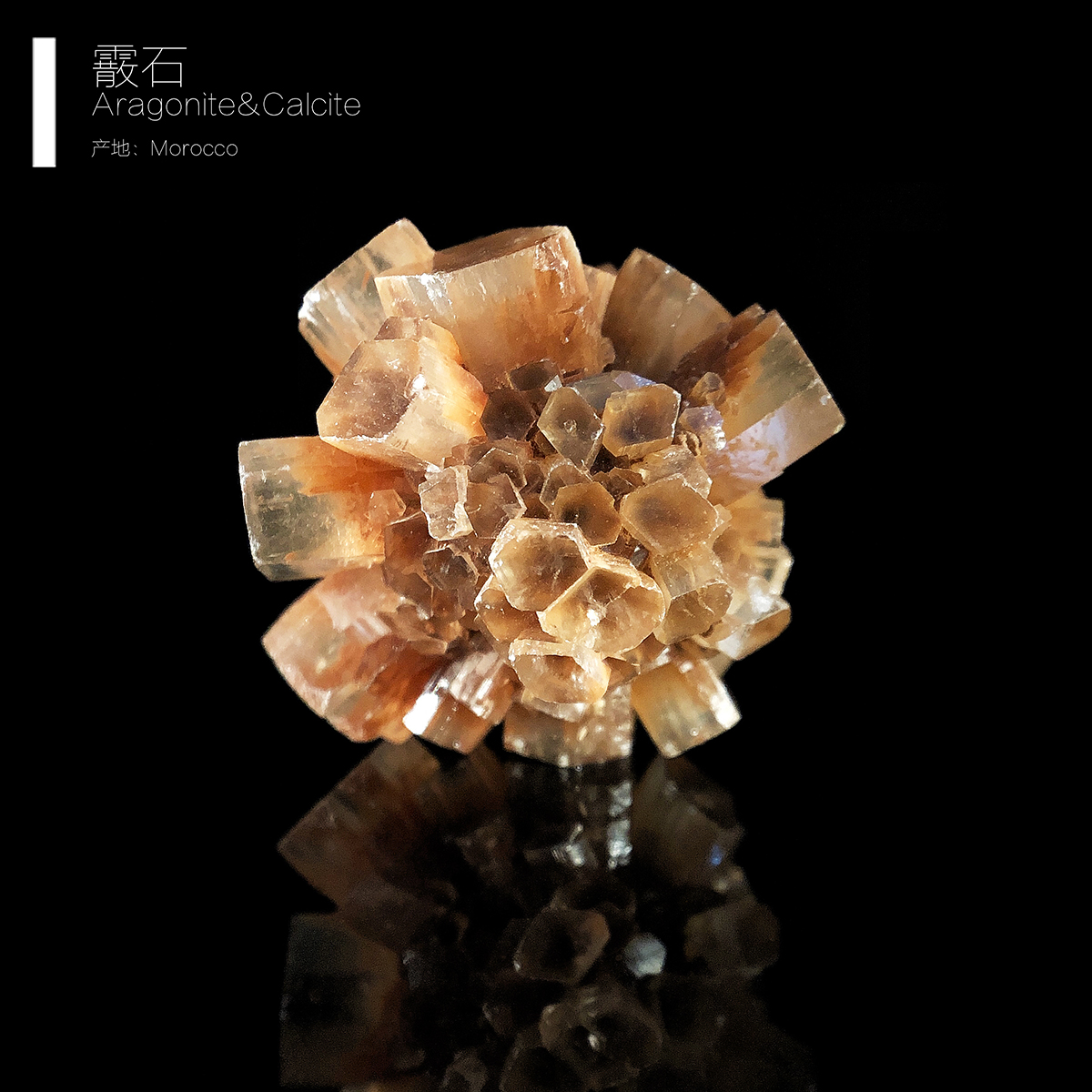 霰石有多种形态,中国境内产的比较常见的有纤维状集合体(比如云南蓝文石),而摩洛哥的这种形态放射状霰石是假六方体柱状晶体的集合体。这里的假六方体是柱状晶体双晶相互交错生长而产生的三连晶,所以截面看起来接近六面体的形态。