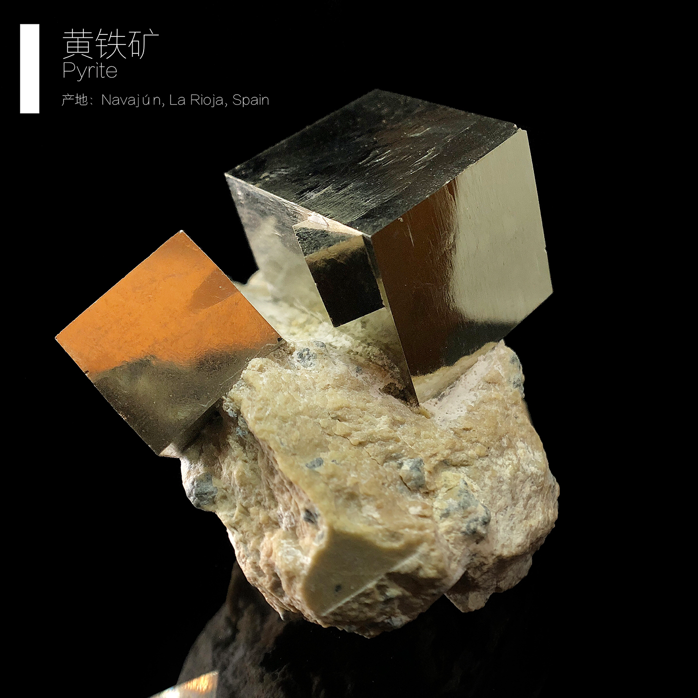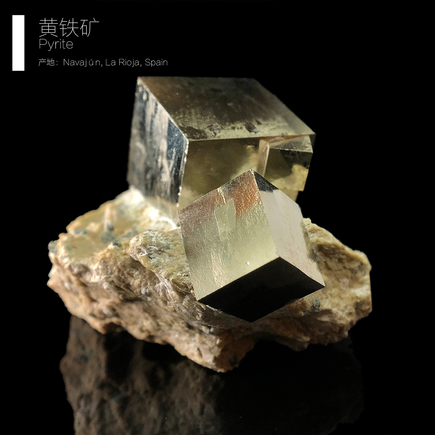 黄铁矿介绍过很多次了所以不再详细作介绍,但西班牙的黄铁矿一直在矿圈是热门品种,因为其标准完美的立方体晶体简直是像教科书一样的存在(。具体产地是Ampliación a Victoria Mine,距离Navajon2.4km,这里产的黄铁矿大多数都是边缘锐利的全浮生立方体,常见穿插晶体。最有意思的是晶体大小的差距也非常大,最大的晶体可以达到19cm的边长。上海的自然博物馆里就有不同大小的西班牙黄铁矿单晶排列成一条长龙的展示。