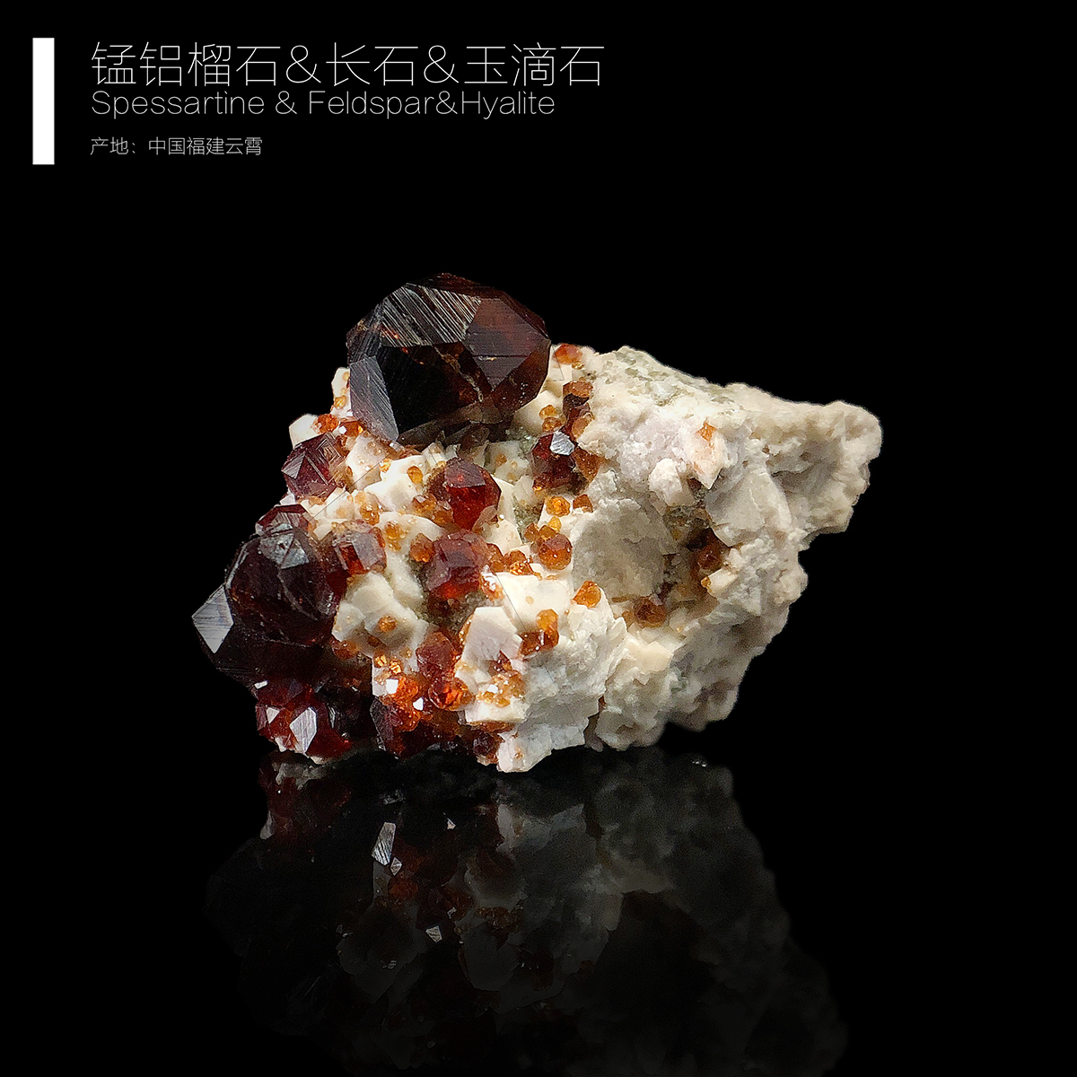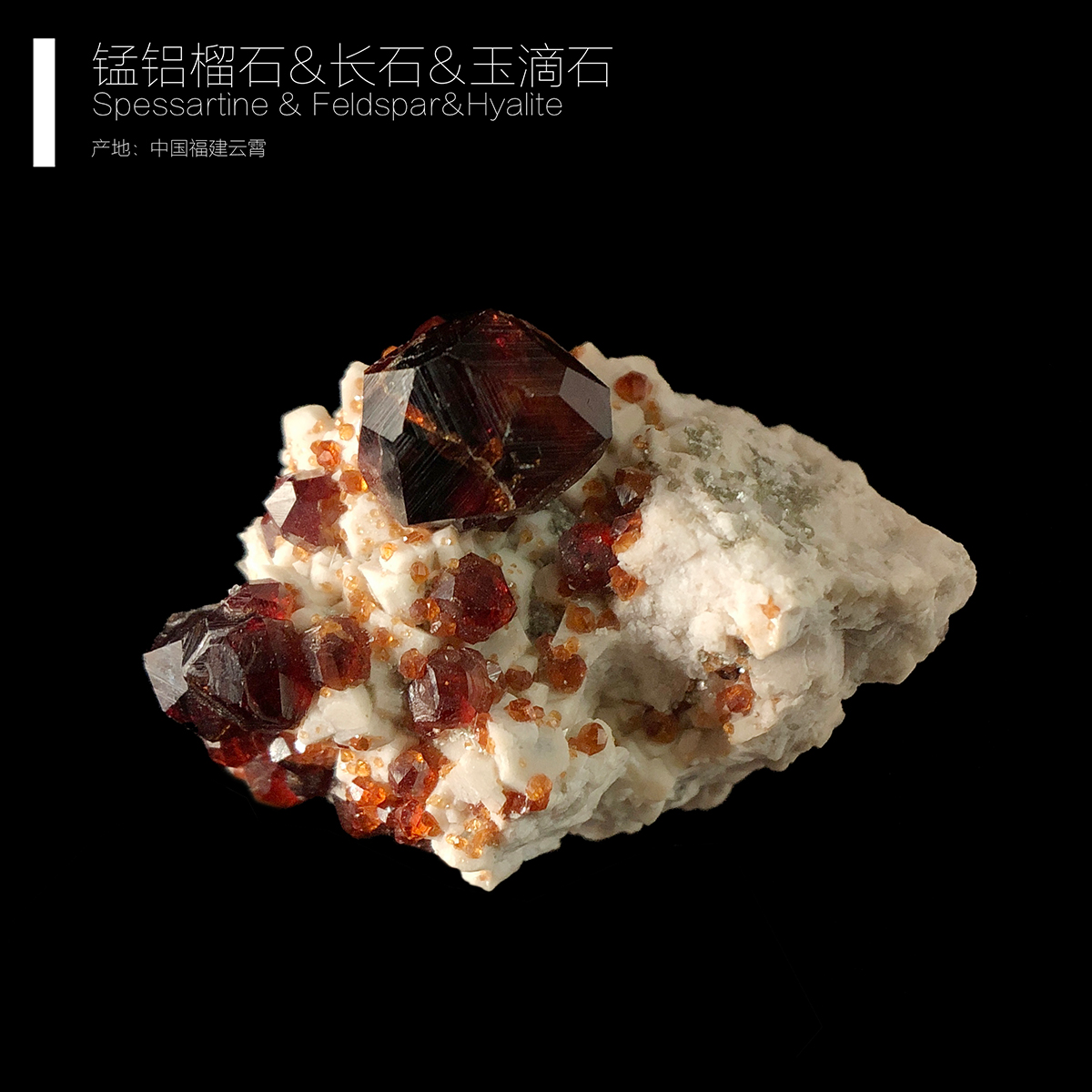几乎矿圈人手好几块的福建产锰铝榴石,常和长石或者烟晶伴生。提起福建矿圈人大概第一反应都是“芬达芬达”吧!福建产的锰铝榴石从深红到浅橙色都有,我这块上面就正好有深红+橙红两种颜色(小晶体偏橙是因为含锰较多,而含铁较多者呈红褐色)