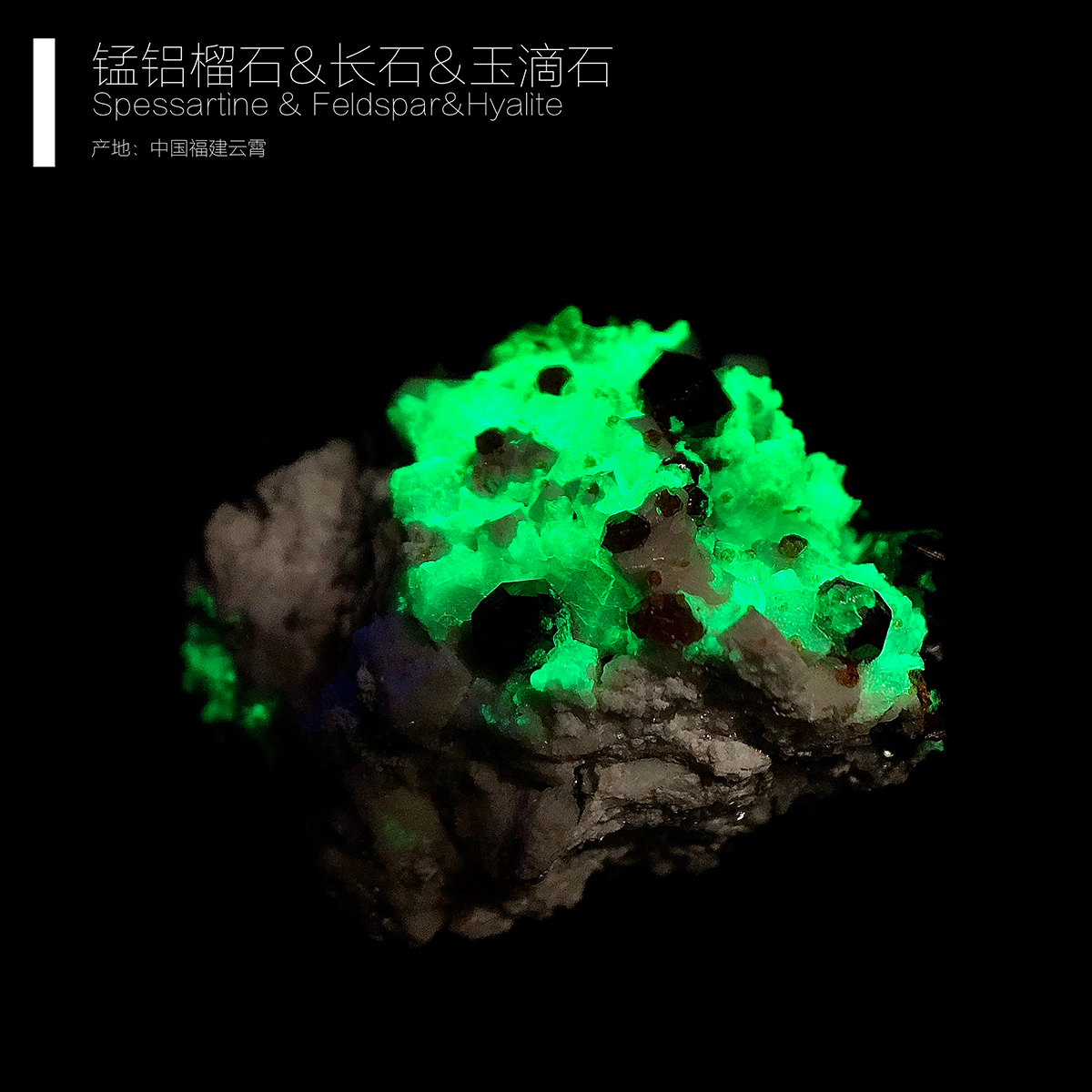 背面其实还有一部分玉滴石和一种不知名的绿色小结晶矿物,玉滴石在短波紫外线下有强烈绿色荧光(p3)。和匈牙利不太一样,福建产的玉滴石无法长成圆润的水花状,大多数是薄薄一层包裹长在长石表面。(但也有小簇花状的玉滴石存在)